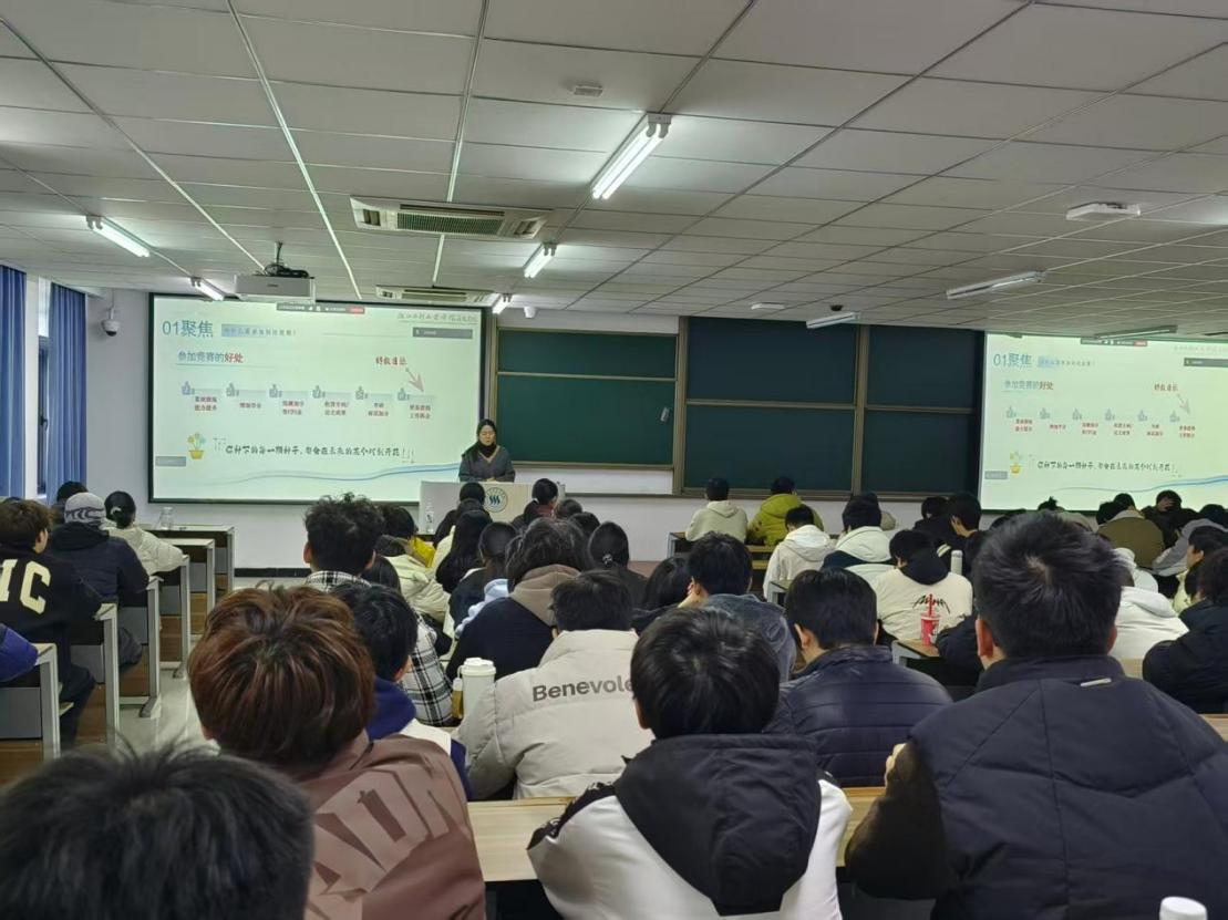 为深化学生对学科竞赛的认识,激发同学们的参赛积极性,我院于12月3日在南浔校区举办线下宣讲会。本次会议邀请专任教师王子艳及大四学生代表胡嘉乐,结合各自经历,围绕参赛意义、赛事类别、报名流程、备赛经验等方面展开分享。王子艳老师首先以研究生期间担任团队负责人参加中国国际“互联网+”大学生创新创业大赛并获奖的经历为例,阐述了参与科技竞赛所带来的多方面收获。她指出,竞赛不仅能锻炼个人综合能力、助力评优评先,还在求职面试中具备显著优势。同时,王老师介绍了学校为鼓励学生参赛推出的相关激励政策,并列举了我院学生适合参加的各类竞赛,如“挑战杯”系列竞赛、浙江省环境生态科技创新大赛、低碳创新大赛等。她强调,优秀